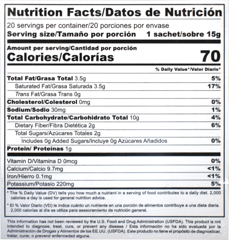 Café, crema no láctea [sólidos de jarabe de glucosa, grasa vegetal, caseinato de sodio (proteína de la leche), dióxide de silico, hidrogeno fosfato dipotásico, tripolifosdato de sodio, mono y diglicéridos de ácidos grasos de glicerol], crema espumosa (jarabe de glucosa, aceite vegetal hidrogenado, leche en polvo, fosfato dipotásico, estearoil lactilatode sodio), leche desnatada en polvo y extracto de Ganoderma Lucidum.