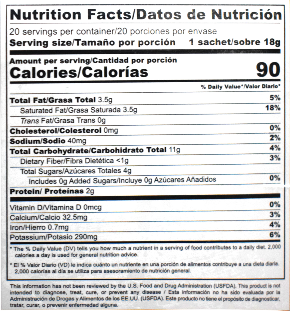 Café, cacao en polvo, crema no láctea [solidos de jarabe de glucosa, grasa vegetal, caseinato de sodio (proteína de las leche), dióxido de silicio, hidrogenofosfato dipotásico, tripolifosfato de sodio, mono y diglicéridos de ácidos grasos, diacetil tartárico y ésteres de ácidos grasos de glicerol], crema espumosa (jarabe de glucosa, aceite vegetal hidrogenado, leche en polvo, fosfato dipotásico, estearol lactilato de sodio), leche desnatada en polvo, aroma de vainilla, extracto de malta (cebada) y extracto de Ganoderma Lucidum.
